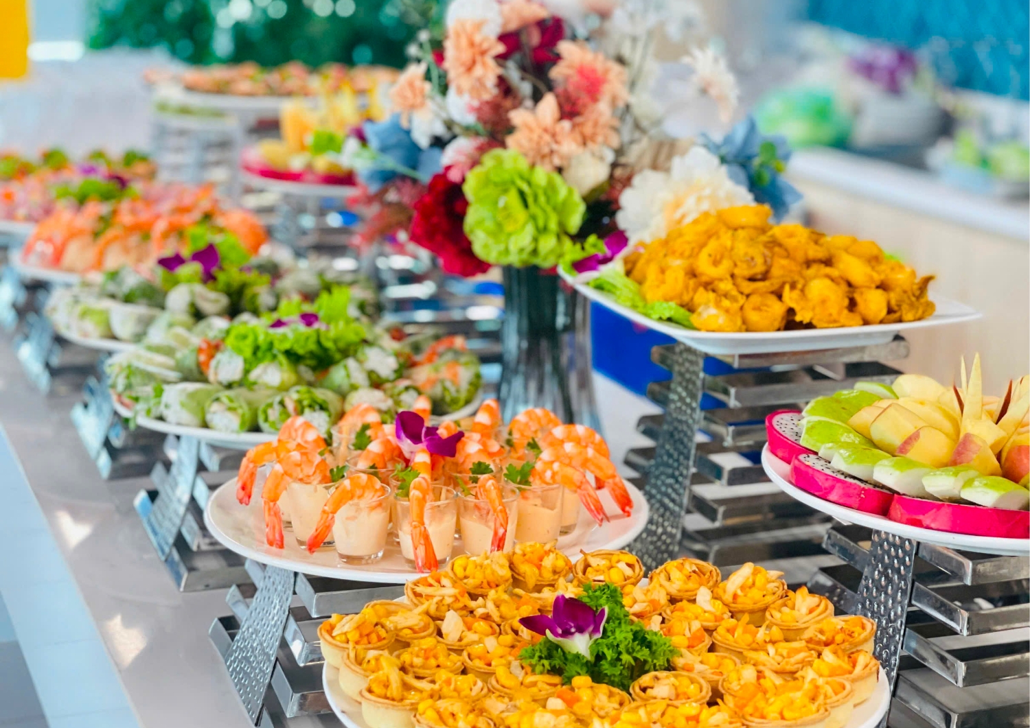 Chúng tôi cung cấp thực đơn buffet đa dạng, bao gồm các món khai vị thanh mát, salad tươi ngon, các món nóng đặc sắc từ Á đến Âu, quầy nướng thơm lừng, sushi và sashimi tươi rói, cùng các món tráng miệng ngọt ngào và trái cây tươi theo mùa. Thực đơn được thiết kế linh hoạt, có thể tùy chỉnh theo yêu cầu và chủ đề của sự kiện.
